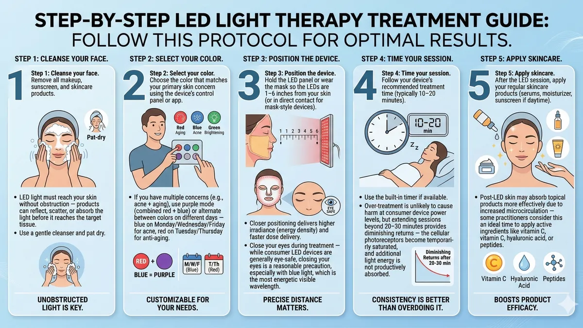 Step 3: Position the device. Hold the LED panel or wear the mask so the LEDs are 1-6 inches from your skin (or in direct contact for mask-style devices). Closer positioning delivers higher irradiance (energy density) and faster dose delivery. Close your eyes during treatment - while consumer LED devices are generally eye-safe, closing your eyes is a reasonable precaution, especially with blue light, which is the most energetic visible wavelength.