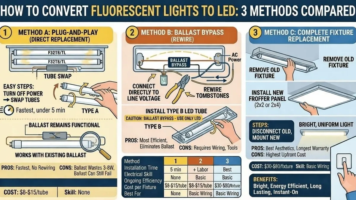 Change a fluorescent light to LED using one of three methods: install a plug-and-play LED tube (Type A) that works with the existing ballast, wire a ballast-bypass LED tube (Type B) directly to line voltage, or replace the entire fixture with a new LED unit. Type A is the fastest - just swap the tube with no rewiring. Type B is the most efficient long-term because it eliminates the ballast, which wastes 3-8 watts and is a future failure point. Complete fixture replacement gives the best light quality and aesthetics but costs the most upfront.